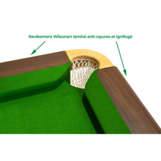 Coloris : Acajou Le cadre et le coffre sont réalisés dans un matériau de surface traité et résistant aux rayures Angles et pieds renforcés Récupération des billes dans les poches en cuir fabriquée à la main sur mesure Pieds avec niveleurs et réglables facilement. Barres transversales de 38 mm d'épaisseur dans la sous-structure Rails en bois massif Bandes équipées de caoutchoucs K-55 de très haute qualité avec le Steelblock 10mm. Tapis club Strachan de couleur vert Anglais